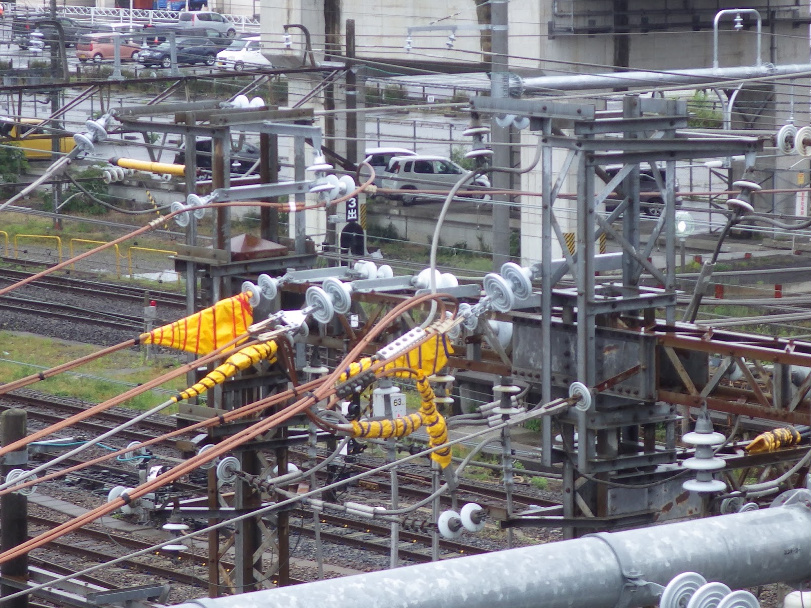 | 構内運用のき電線が新しい鉄構につながる 下部よりブスバーの接続部が伸びる |