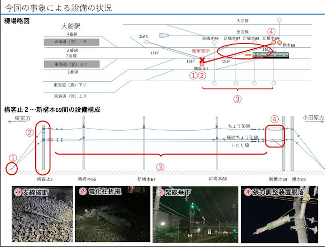 「渡り線のコンパウンドカテナリー架線部のハンガーが共振で金属疲労破断、補助吊架線とトロリ線が垂下したところに当該電車が進入。補助吊架線とトロリ線をパンタグラフがひっかけて張力発生。渡り線終端部の架線柱を引きずり倒したところに時速80㎞の当該電車が進入し接触。補助吊架線とトロリ線を引きちぎり約140m先で停車。本線上のインテグレート架線部には影響が出てないため早期に復活」と読んだ。