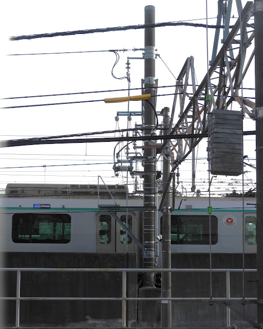 上の架線柱の右側にも接地回路付き断路器が2台あり2,3を区分している 1は車庫入口で区分済 |