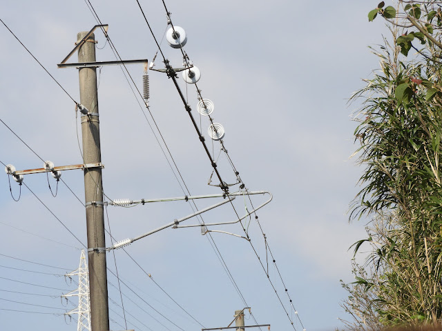 | 奥架線柱にTFき電線が引留め トロリ線に繋がる 別電源とオレンジ帯は無 AT(AF)き電線が通過している |